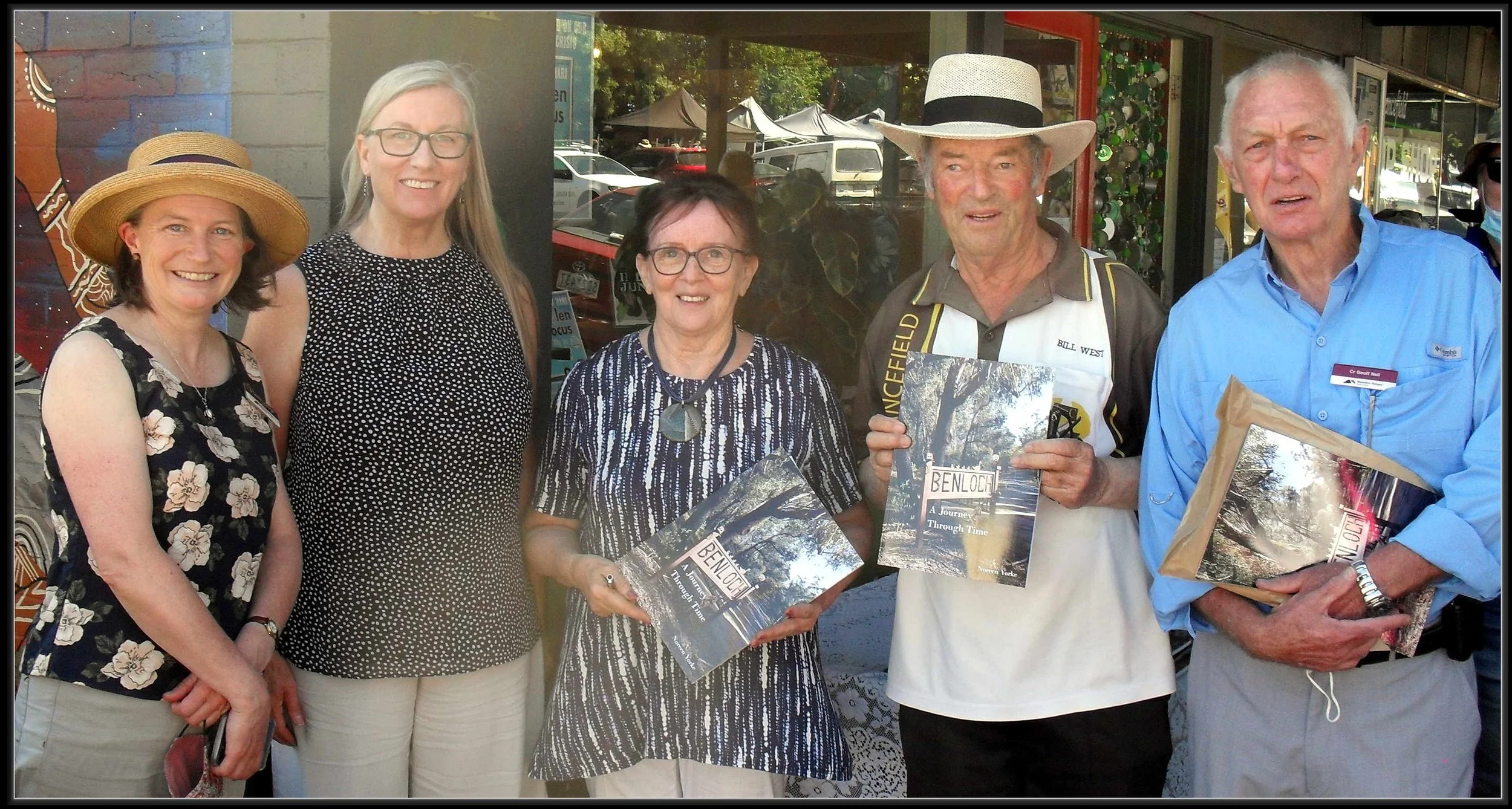 L to R: Mayor of Macedon Ranges Jennifer Anderson, Heather Longmuir, Noreen Yorke, Councillors Bill West and Geoff Neil, outside Red Door Books, Lancefield on Saturday 22 January, 2022.